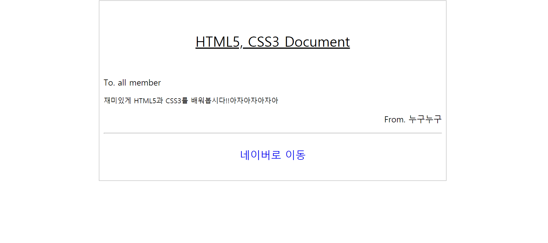 <p>재미있게 HTML5과 CSS3를 배워봅시다!!아자아자아자아</p>