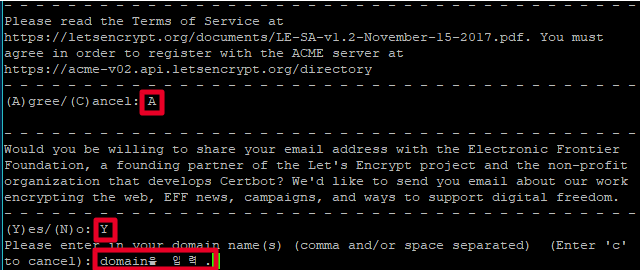 곧이어 동의 절차글이 나타난다. A, Y를 차례대로 입력하고 마지막으로 ssl 인증설르 발급받을 도메인을 입력한다.