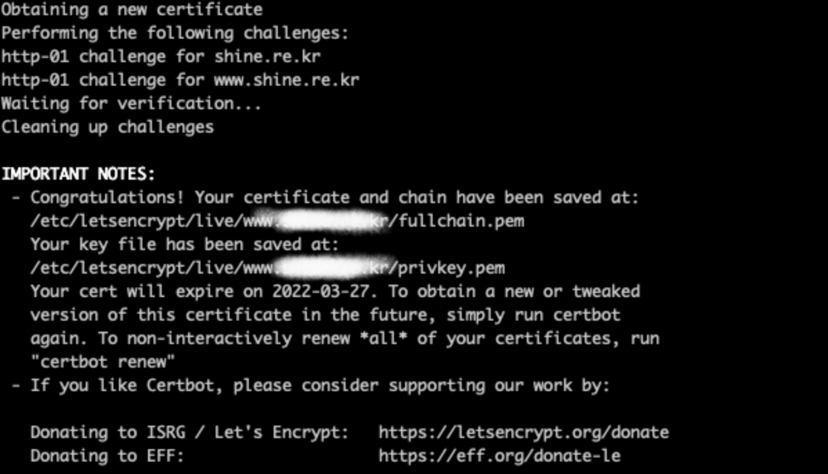 위처럼 Congratulations!! 문구가 뜨면 성동! 그리고 /etc/letsencrypt/live/도메인/ 경로에 fullcahin.pem과 privkey.pem 가 발급되었다고 안내한다. 위에서 알려주는 경로로 이동하자. (live 폴더 이상 안들어가진다면 접근권한이 없는 것이므로 sudo -i로 접근하거나 root로 들어가면 live폴더 이상 접근 가능하다.)